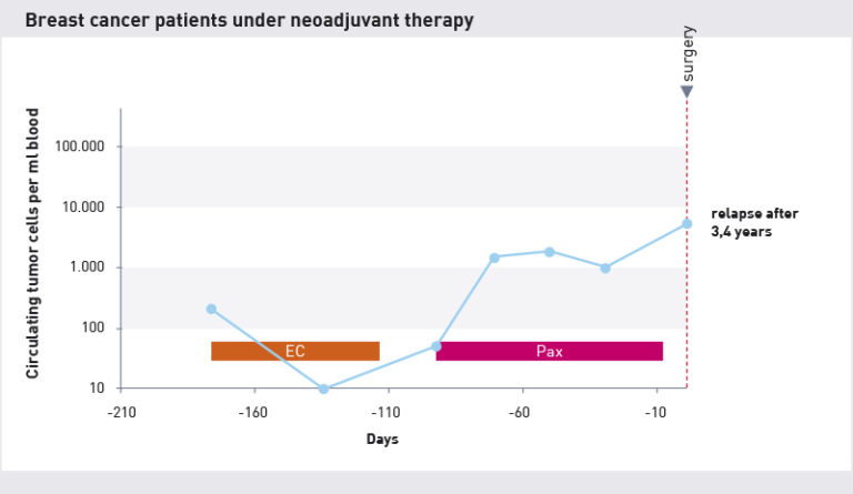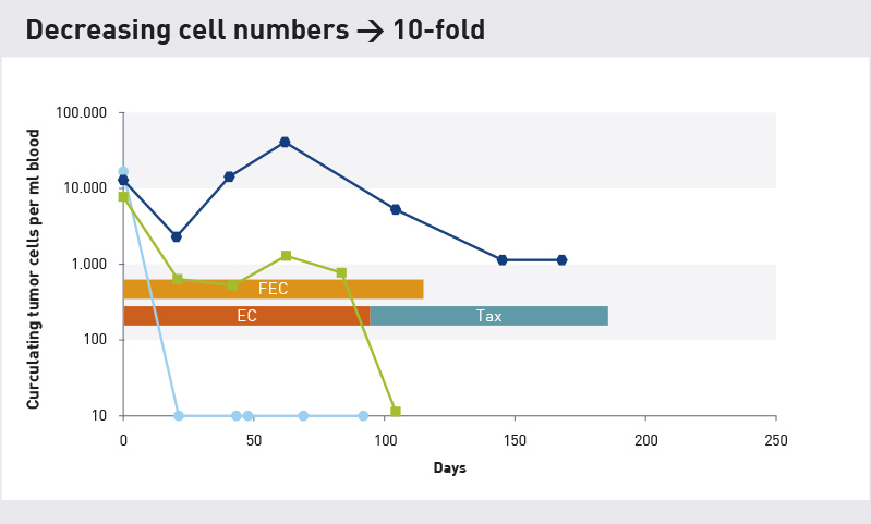 Doświadczenie pokazuje, że liczba krążących komórek nowotworowych we krwi zmniejsza się u pacjentów, gdzie zaobserwowano dobrą odpowiedź na leczenie po pierwszych 1-3 cyklach. Jeśli liczba komórek zmniejszy się i pozostanie na niskim poziomie do końca chemioterapii, oznacza to pozytywny, późniejszy przebieg leczenia. W badaniach z udziałem pacjentów z rakiem piersi bez przerzutów 90–95% pacjentów pozostawała wolna od nawrotów (bez nowych guzów) nawet po 4-5 latach, jeśli wcześniej wykazywała 10-krotny spadek liczby komórek.